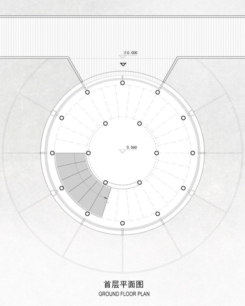 the project sits like a ring placed over the terrain, with its funnel-like roof forming a shaded perimeter walkway and an introverted core.