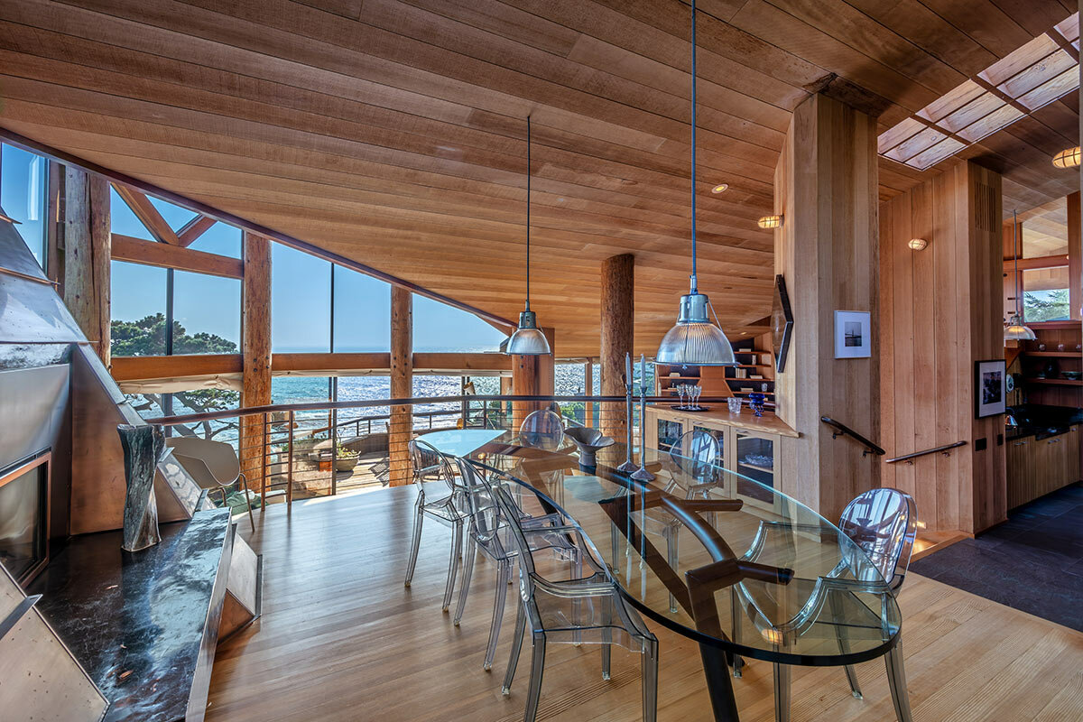 a bedroom is surrounded by views across the forest canopy and Pacific Ocean beyond