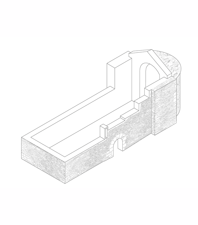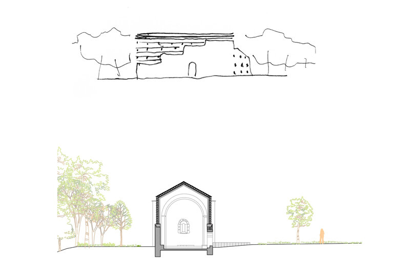 other interventions from this restoration include a single path, which ramps down to the arched entrance of the hermitage. once inside, visitors will also see the exposed metal structure that supports the new stone walls and roof.