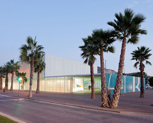 the project sits like a ring placed over the terrain, with its funnel-like roof forming a shaded perimeter walkway and an introverted core.
