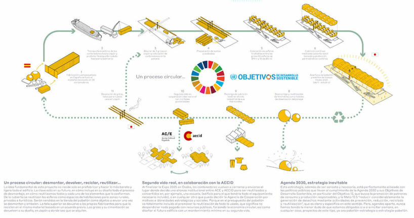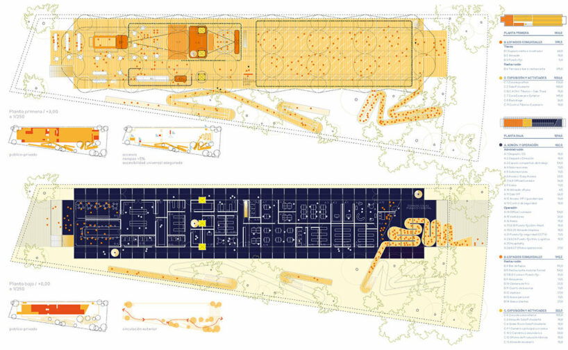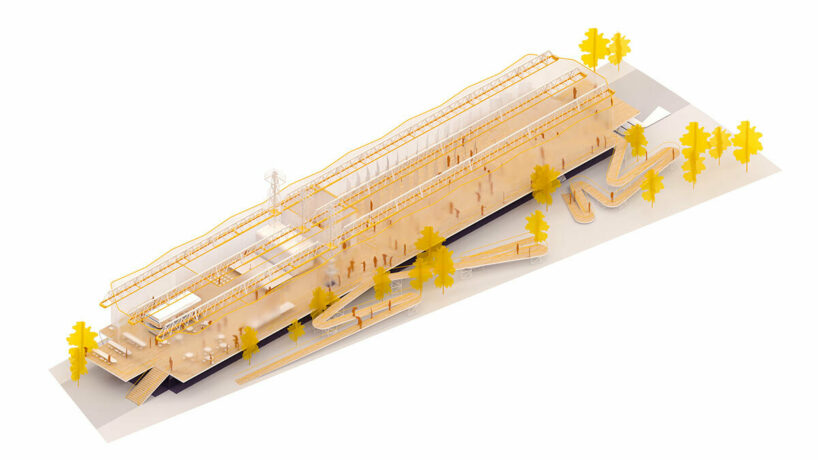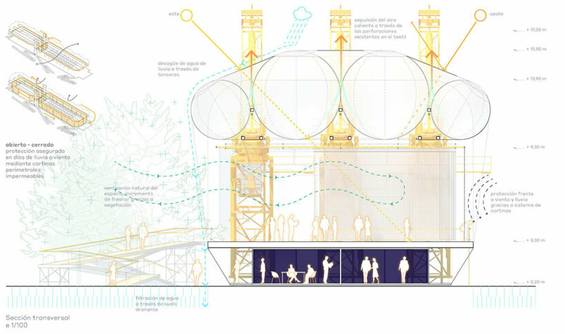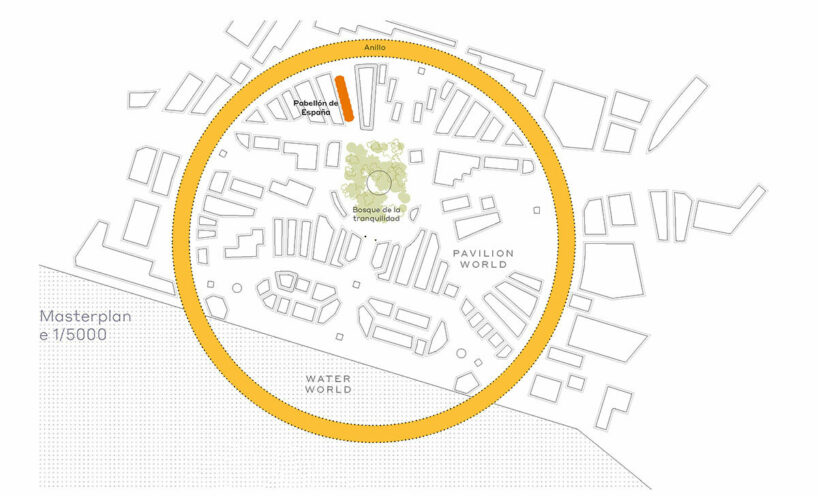 the project sits like a ring placed over the terrain, with its funnel-like roof forming a shaded perimeter walkway and an introverted core.