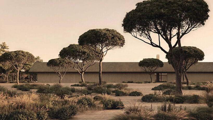 Architecture and design firm MVP brings Casa Serena to the landscapes of Comporta in Portugal. The project, in its initial planning stage of development, emerges as a residential estate concept with a harmonious indoor-outdoor living experience that embodies the tranquility of the Atlantic shores. More so, MVP seeks to reflect the fusion of local architectural heritage with contemporary minimalism and brutalism. Living spaces reveal a refined palette of earth-toned concrete, local woods, thatched roofs, and steel accents. Sacral openings in the facade and retractable windows accentuate the fluid transition from an intimate ambiance to the wider landscape.