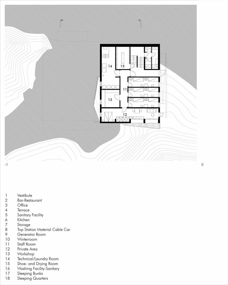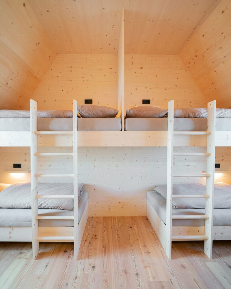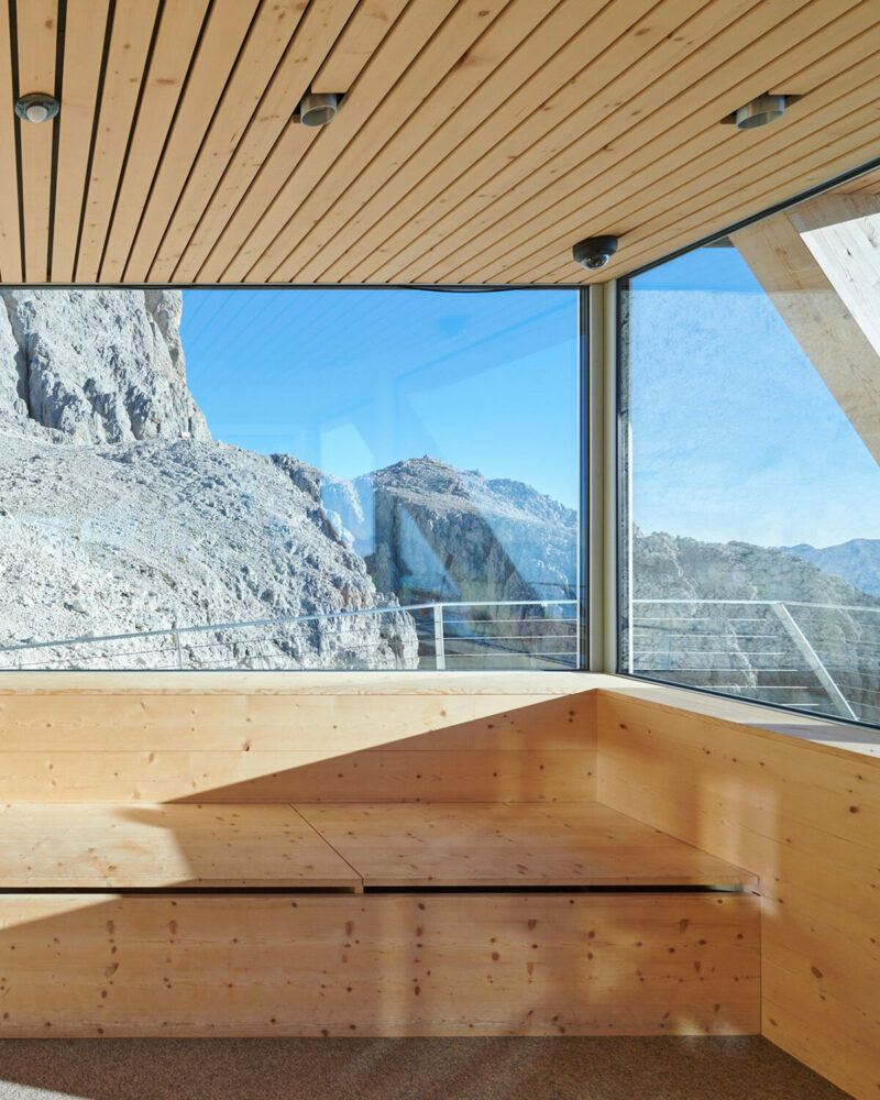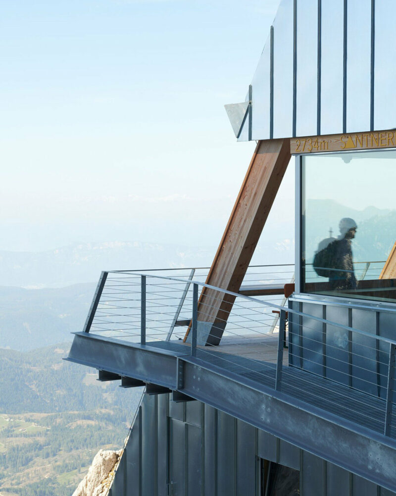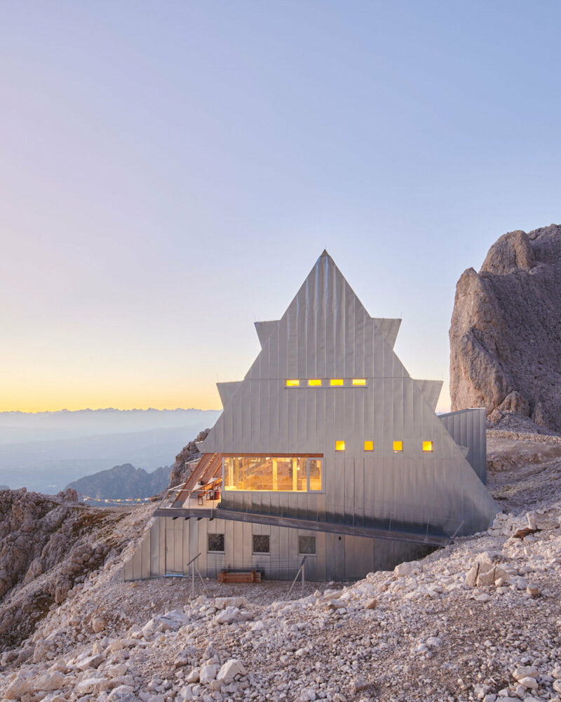 the galvanized sheet steel cladding protects the hut from the harsh mountain climate