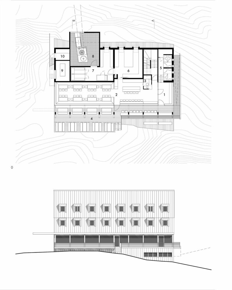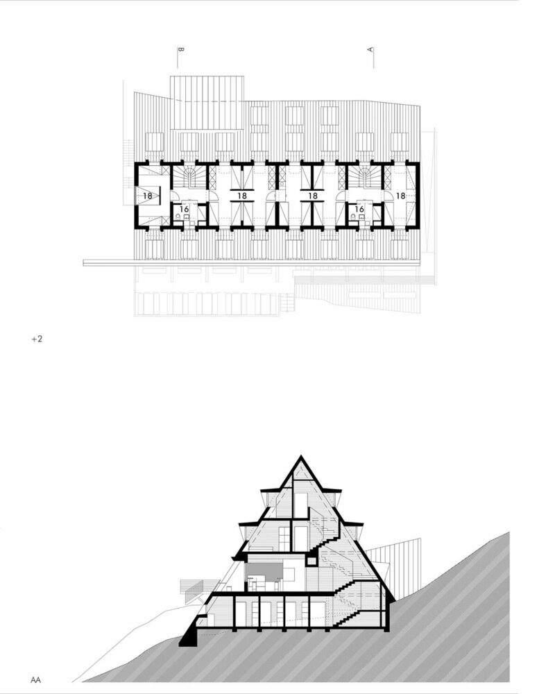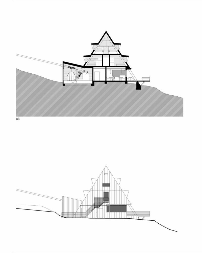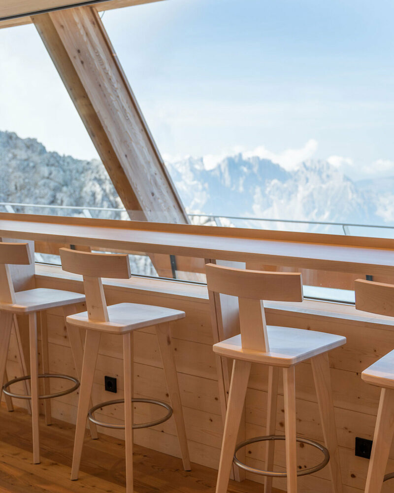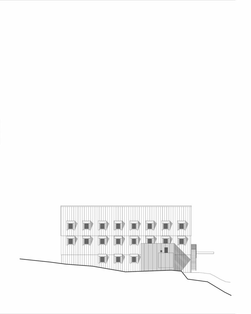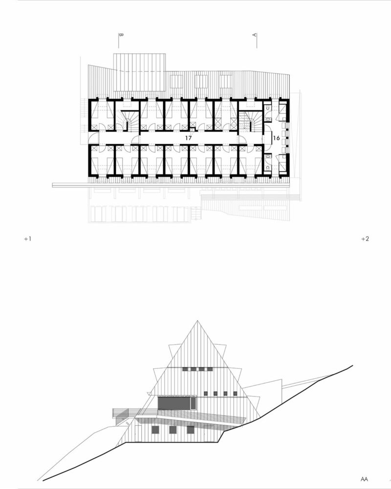 the galvanized sheet steel cladding protects the hut from the harsh mountain climate