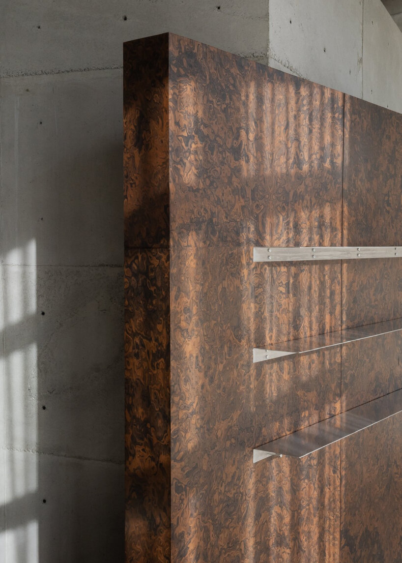 a central column is partially clad in richly patterned Californian burl wood and elevated into a sculptural feature