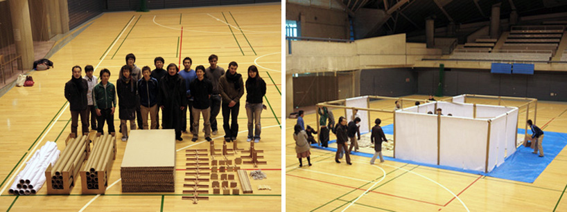 the partition system is based on the needs and constraints the architect witnessed in response to emergency situations over the past seven years. these photographs show their early experiments with cardboard-based modular shelter design.