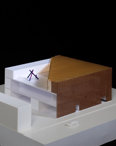 the project sits like a ring placed over the terrain, with its funnel-like roof forming a shaded perimeter walkway and an introverted core.