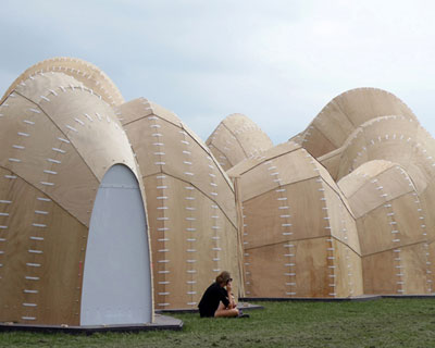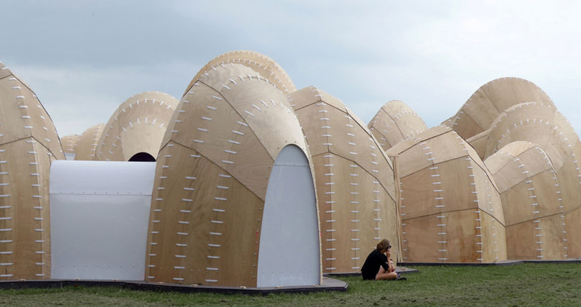 a series of shells constructed of a single catenary curve repeated, rotated and enlarged, designed by SHJworks forms ‘the velvet state’, a temporary facility for the exploration of sensuous society composed of 10 archetypes for the 2013 roskilde festival  in denmark. since its conception in 1972 the event has promoted international cultural experiences of music and the creative arts. throughout the process the artists and architects worked together to create an other-worldly set, where they could explore the manifestation of arnold van gennep’s concept of liminality. the cooperation is visible in the tectonic, which resembles costume construction, with polycarbonate stitches holding together the plywood panels supported by sheets of the material bent into arches. the 794 square meter space is an assembly of five backstage areas composed of 12 rooms which make up ‘the ring’, ‘the ridge’, ‘the reactor’, ‘the barn’, and ‘the dressing room’. in the center ‘the courtyard’   accommodates the main acts of collaborative partners fiction pimps from denmark and british troupe collective unconscious. ‘the stage’ serves as a portal between the open ring and the central enclosure. the structure’s dichotomy serves creative performances by an array of international artists, and it doubles as the metaphorical entrance into a new experience, and the spectator’s renewed emergence therefrom.