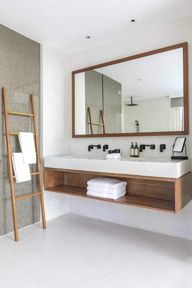 Finally, two additional pavilions below the main building serve as an open gathering space. There sits four guest bedrooms, each fitted with an en-suite bathroom connected to the surrounding nature. Open-sky and open-air bathtubs or outdoor tropical showers complement these rooms, enabling a sensorial healing experience with clutter-free and customized terrazzo washbasins.