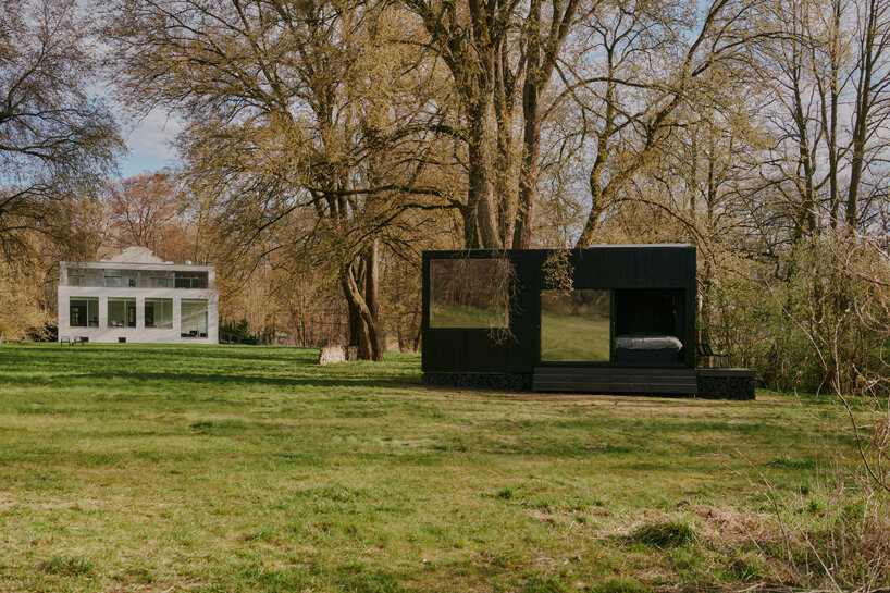 The new cabin is sited on the grounds of Wehrmuehle, a historic estate and cultural venue one hour north of Berlin. Sigurd Larsen’s design maximizes the limited 18 sqm space with high ceilings, generous windows and skylights as well as large sliding glass doors, which blend the line between inside and out while elegantly framing the surroundings.