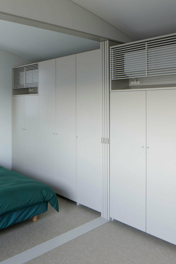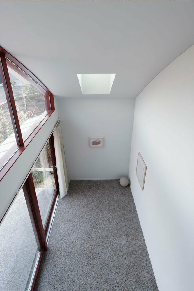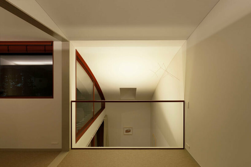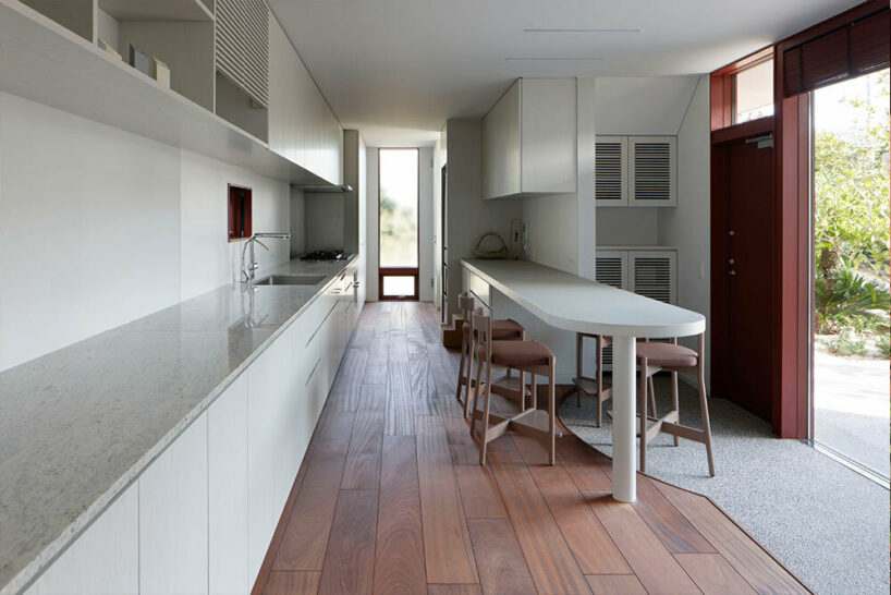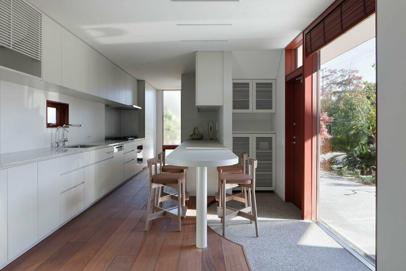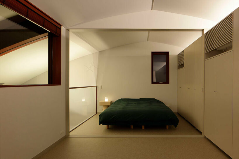 The second level accommodates the residents’ private bedrooms and is connected to the atrium, allowing a visual connection with the floor below and also the ventilation to circulate throughout the house. ‘While the chairs on the first floor were designed to match the counter, a low table was originally created for the second floor, where a sense of calm was demanded. This contrasts with the first floor by emphasizing the nature of floor seating,’ explain the architects.‘By planning the surrounding environment, architecture, interior, and furniture in conjunction with the client’s thoughts, we attempted to firmly define the house’s way of being.’