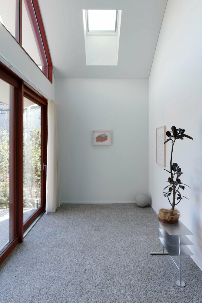 The reddish exterior walls were then topped with a silver roof and eaves made of galvalume steel sheet. Japanese tropical plants decorate the exterior to further heighten the contrast with the surrounding vegetation. By adding the greenery at its side, the team sought to add a visual continuity that leads to a large earth floor with an atrium. The area from the entrance to the earth floor is finished with a reddish stone mixed with washed-out stone. This floor connects both the inside and the outside of the house, blurring the boundaries in a variety of situations.