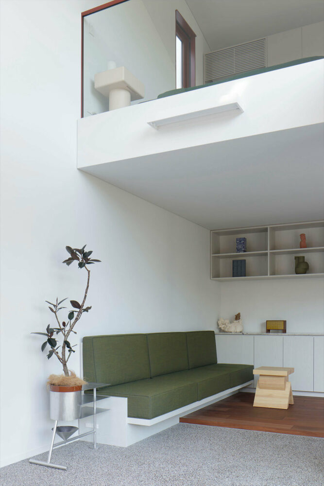 The ground level hosts the living and dining room but can also turn into a semi-public exhibition space during events. To add flexibility to the space, the architects set the dining counter higher than usual so it can double as a display stand for exhibitions. Furniture such as counters and sofas were placed at the boundary between the earthen floor and the wooden flooring so that people could use them without taking off their shoes.