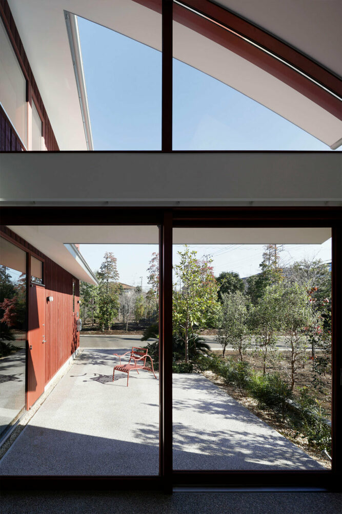 The building stands out thanks to its ‘bengara’ red color, a highly weather-resistant pigment common in Japanese houses. With this bold color that dresses its exterior, the design team sought to form a structure that comes in juxtaposition with the green backdrop. ‘Rather than using the same color as the surrounding area to blend in with the environment, we intended to use a contrasting color to strengthen the significance of the architecture in this location,’ explained the architects