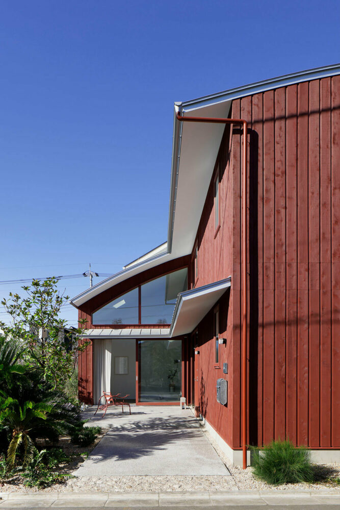 topped with a silver roof, deep red exterior clads wooden house in tokyo
