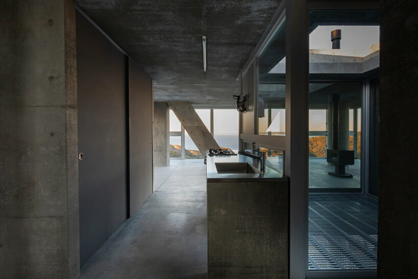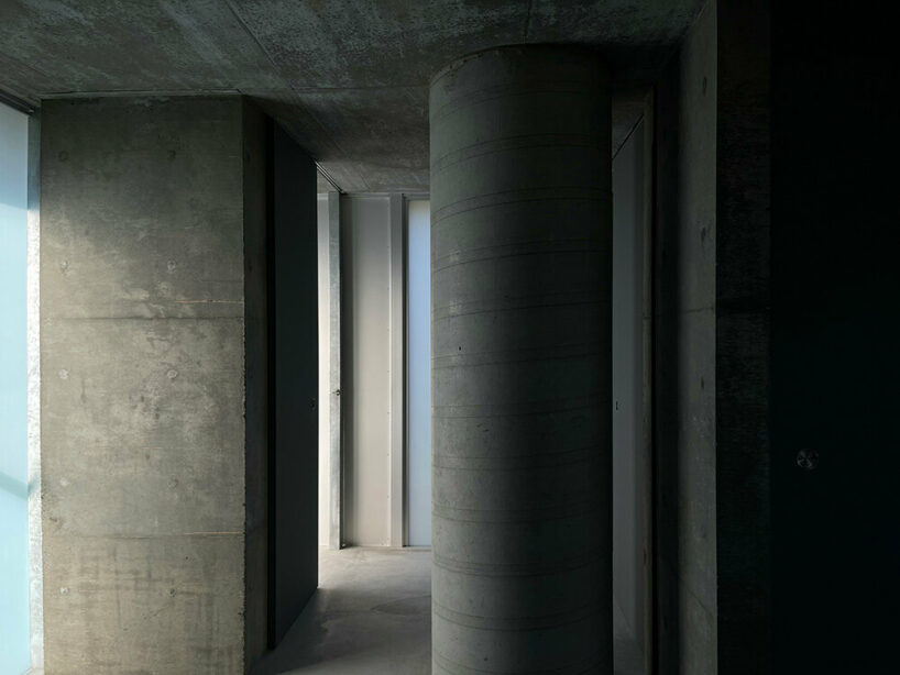 the project sits like a ring placed over the terrain, with its funnel-like roof forming a shaded perimeter walkway and an introverted core.