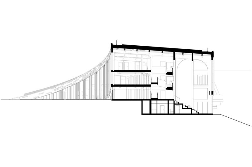 the project sits like a ring placed over the terrain, with its funnel-like roof forming a shaded perimeter walkway and an introverted core.