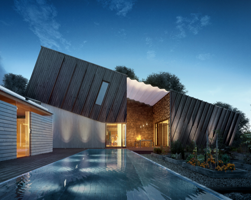the residence’s composition is distinguished by a metal-clad inclined volume, with an interjected void to create a central courtyard. the slanted roof surface features a building-integrated photovoltaic array, which is essential to achieving emission neutrality. to enhance the house’s livability, the property includes a variety of spaces that can be enjoyed year round, as well as fruit trees and a vegetable garden to provide small-scale food production. additionally, the property features an outdoor swimming pool and shower, which are both warmed by solar-generated heat surplus.