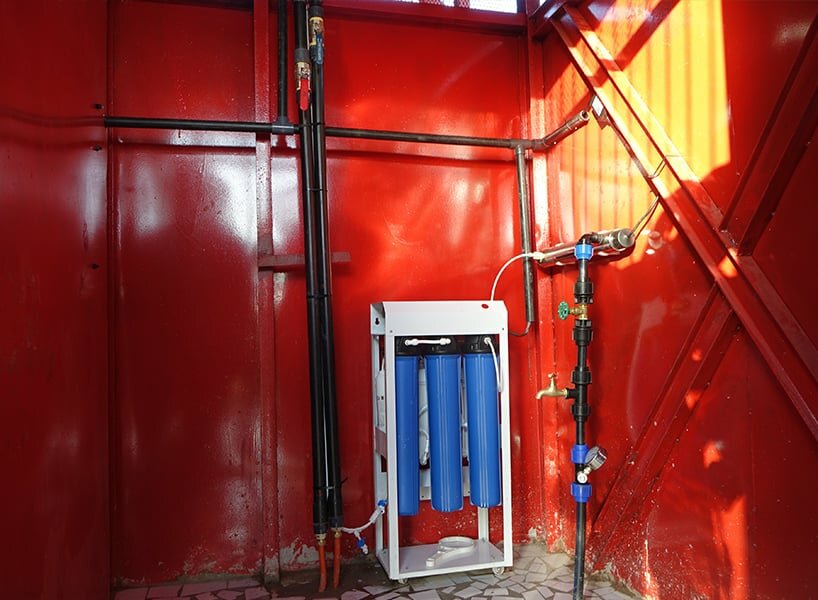 The extracted water is sent to a phased filtration system, initially transferred through a pre-filter with membranes that removes sediment and dust, then passed through an Inox pipe with a UV lamp for sterilization and elimination of bacteria. The purified water is, finally, sent to an osmotic membrane filter that eliminates 95-98% of bacteria including, cholera, staphylococcus, and giardia, and is collected in sterile basins to be ready for beneficiaries’ use. The construction connects to taps that are easily used by the community, see more here.