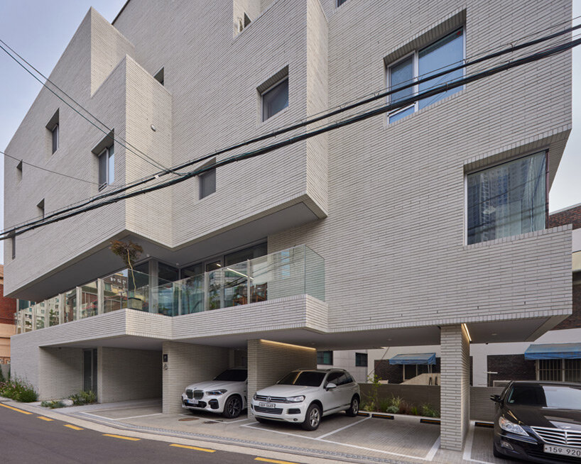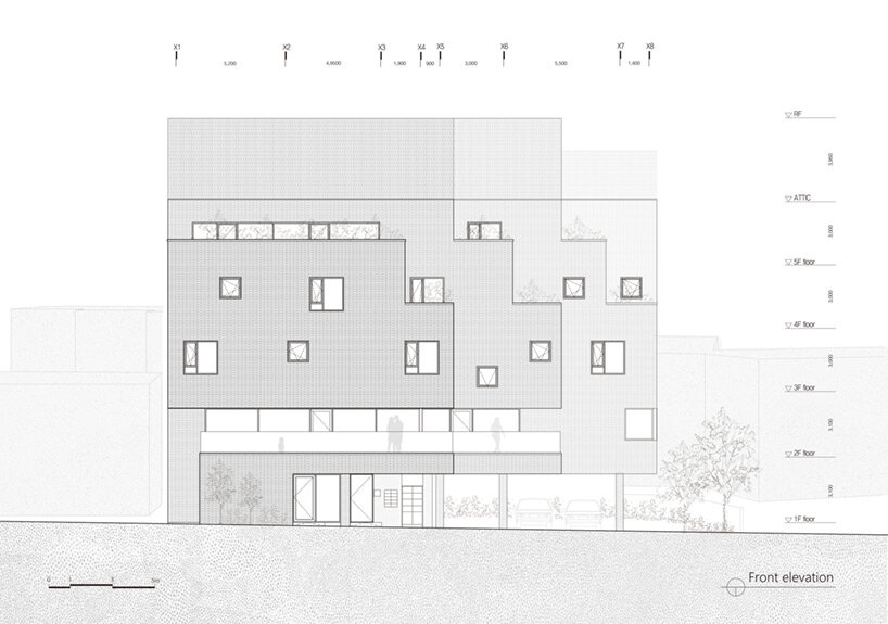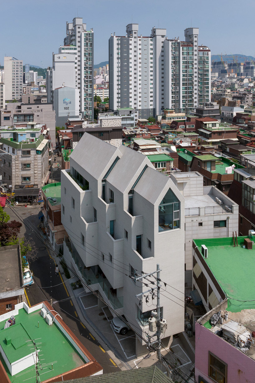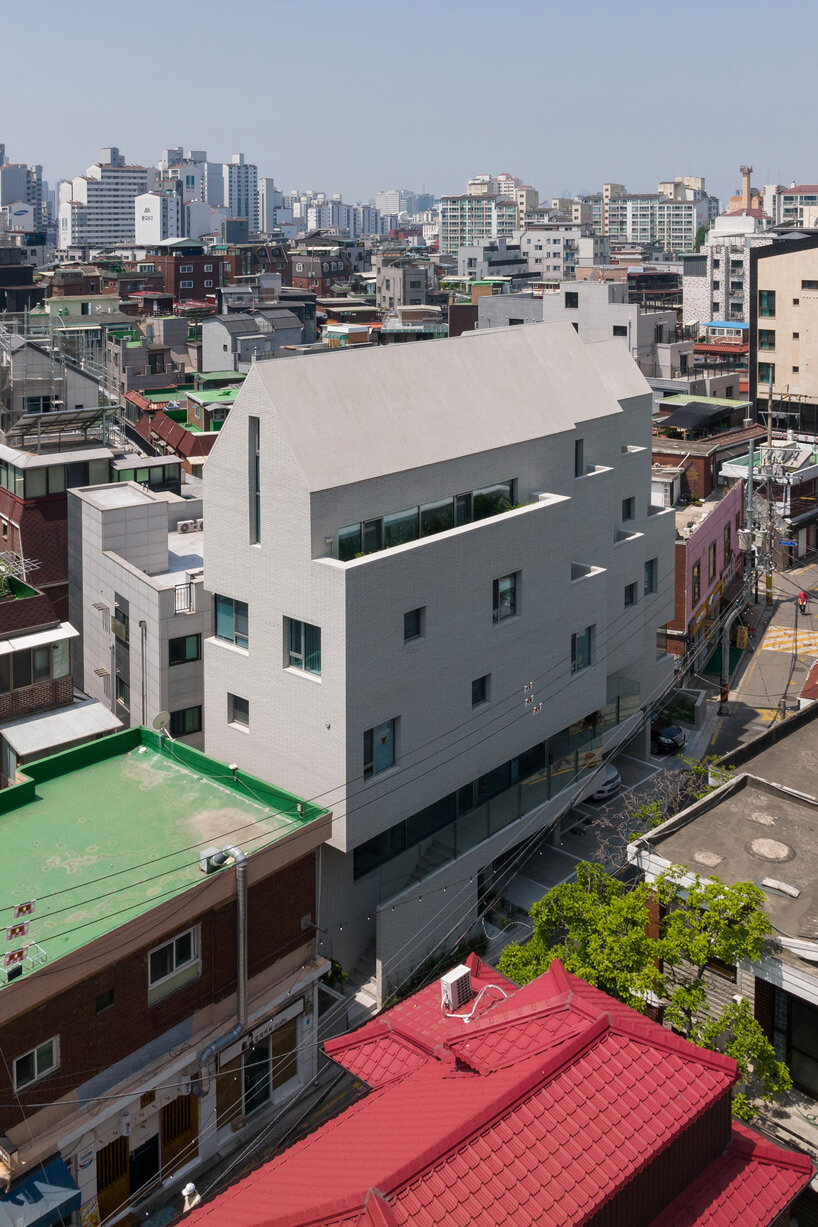 the project sits like a ring placed over the terrain, with its funnel-like roof forming a shaded perimeter walkway and an introverted core.