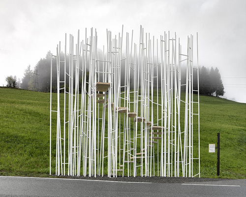 seven international architects — engaged in close collaboration with regional partner offices and local craftspeople — have designed small shelters for the village of krumbach, austria in the bregenzerwald. ‘project BUS:STOP’ comprises the work of sou fujimoto, rintala eggertsson architects, architecten de vylder vinck taillieu, ensamble studio/antón garcia-abril and débora mesa, smiljan radic, amateur architecture studio/wang shu and lu wenyu, alexander brodsky who have visualized small-scale functional buildings in the public sphere for the local inhabitants. ‘BUS:STOP’ creates a dialogue with the people, landscape and local culture, building upon the traditions of skilled trade in the area. the project is currently exhibiting at vai vorarlberger architektur institut until august 2nd, 2014. in addition to the scale models, the exhibition presents photographs and film material about the making of the seven small-scale covered waiting areas.