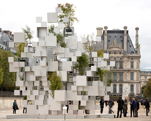 marking his first work in paris, japanese architect sou fujimoto has realized a monumental installation as part of the small nomad house series, set with the tuileries gardens. presented for FIAC — an artistic program which sees the creation of both gallery-based and public creative projects — the floating volumes that comprise ‘many small cubes’ create ‘a new experience of space, a rhythm of flickering shadows and lights like the sun filtering through leafy trees’ fujimoto describes. aluminum cubes, attached to one another by only an edge or a corner, seemingly hover in mid-air as they rise above the landscape, forming a visually light and aerial architectural piece.