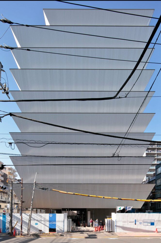 The sloping walls protect the interior, which is open in all four directions, from outside looks. They are made of thin aluminum plates four inches wide, a material of a relatively familiar size to humans. ‘Rather than constructing a large building with large modules, we brought small-scale things together to create a bigger scale. Therefore, it has more in common with how nature is formed and grow.’ the architects explain.‘Through such a creation method, the building becomes part of a new townscape.’
