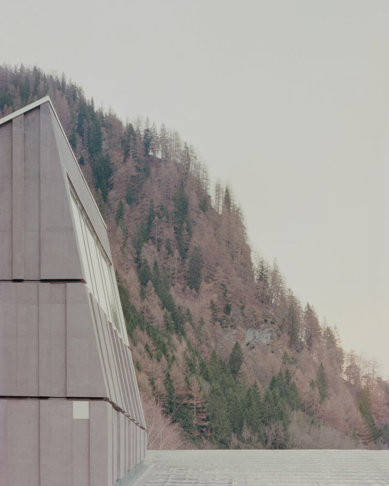 The use of pigmented concrete treated with different degrees of sandblasting lends the building a transformative character. The surface shifts color throughout the day and with changing weather conditions, emphasizing the natural aesthetic of the structure. The gym’s north face, characterized by a convex angle, stands as a powerful visual element reminiscent of an imposing rock wall.
