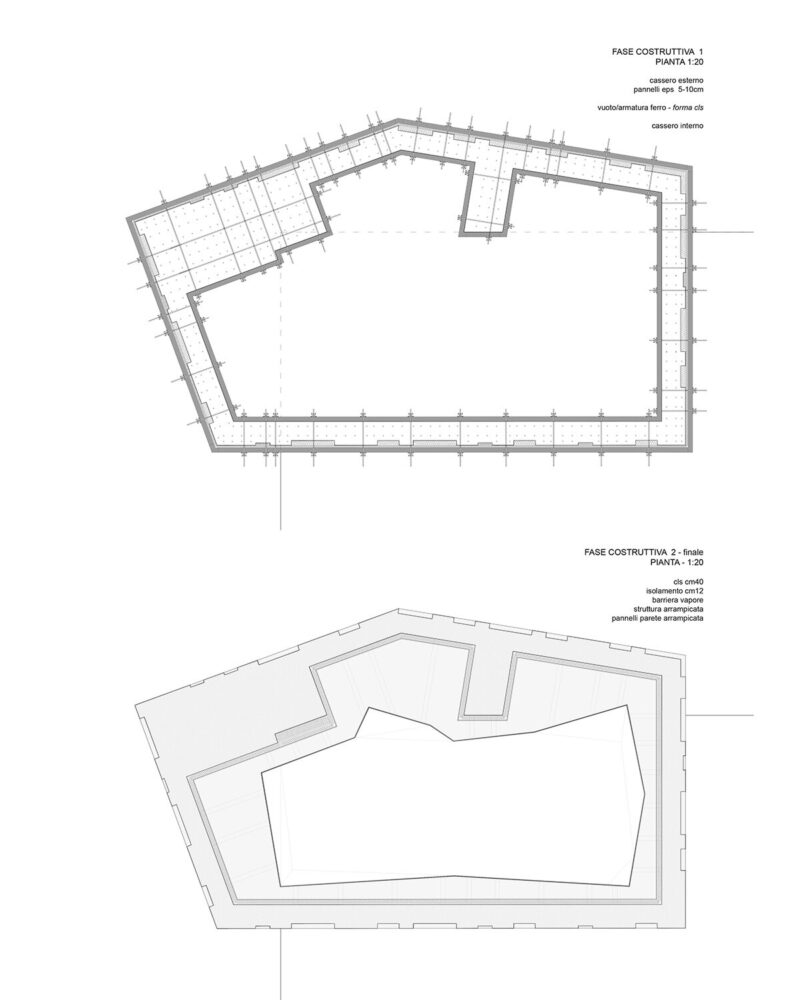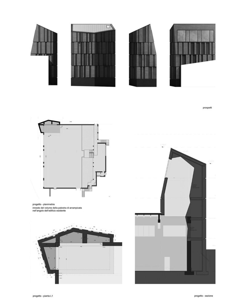 The design approach focuses on integrating the building into the landscape, leveraging a strategic layout and volume configuration. The climbing gym features a series of inclined facades of varying dimensions, enhancing its lateral perception. This design choice ensures that the concrete structure is perceived in parts rather than as a complete entity from any viewpoint, particularly when approaching via existing access routes. The unique polygonal layout, combined with a sloped roof, results in a volume that resembles a jagged rock outcrop — a bold, vertical monolith that blends with its wooded surroundings.
