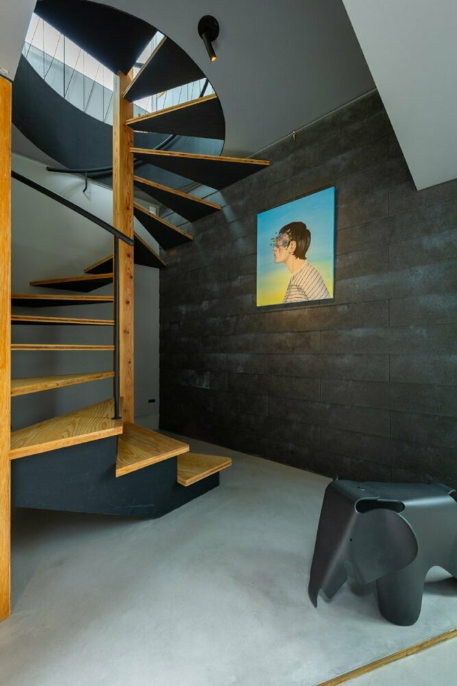 The courtyard puts up triple-glazed plastic allowing natural light to the bright interior. Two spiral staircases are located at the corners of the L shape on the top floor, one leading to the entrance and the other to the bedrooms. The entrance’s staircase serves as a vertical gallery, while the second flight of stairs separates the living room and dining kitchen. In the dining zone, the pantry, wash utility, bathroom, toilet, and bedroom spiral staircase are half-closed with only the upper part forming a continuous plan. The project forms a single-flow shell-like space under the eaves where public and private spaces are blended together and views of the sky can be seen from any area of the structure.
