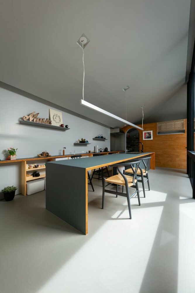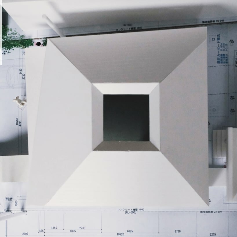 The upper floor volume is L-shaped arranging an open courtyard atrium in the center. By keeping the height of the central courtyard as low as possible and minimizing the openings around the perimeter, the design team forms a one-room space that opens a large four-by-four meter square skylight letting ample light within the structure and creating interesting skyscapes throughout the day. The living room and dining room are organized in an open-plan layout that fits the site.