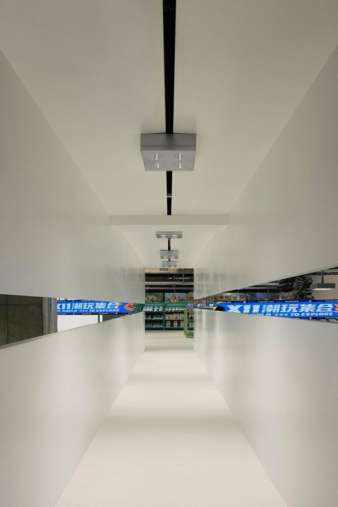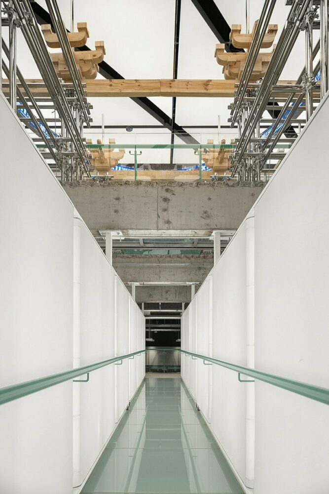 the project sits like a ring placed over the terrain, with its funnel-like roof forming a shaded perimeter walkway and an introverted core.