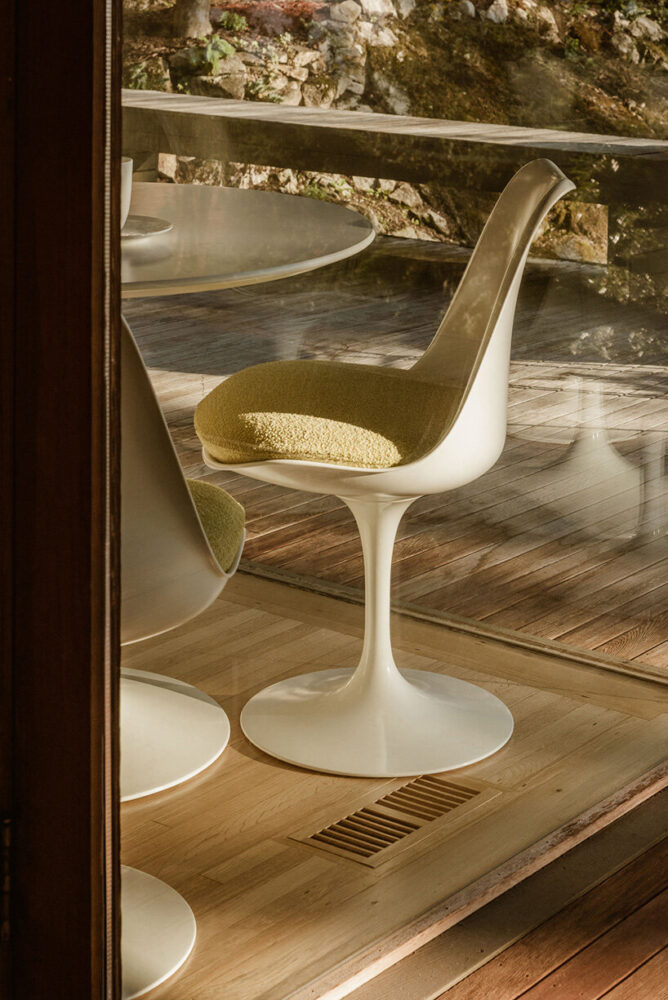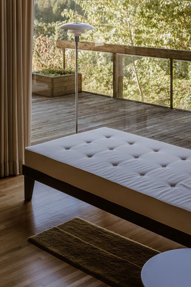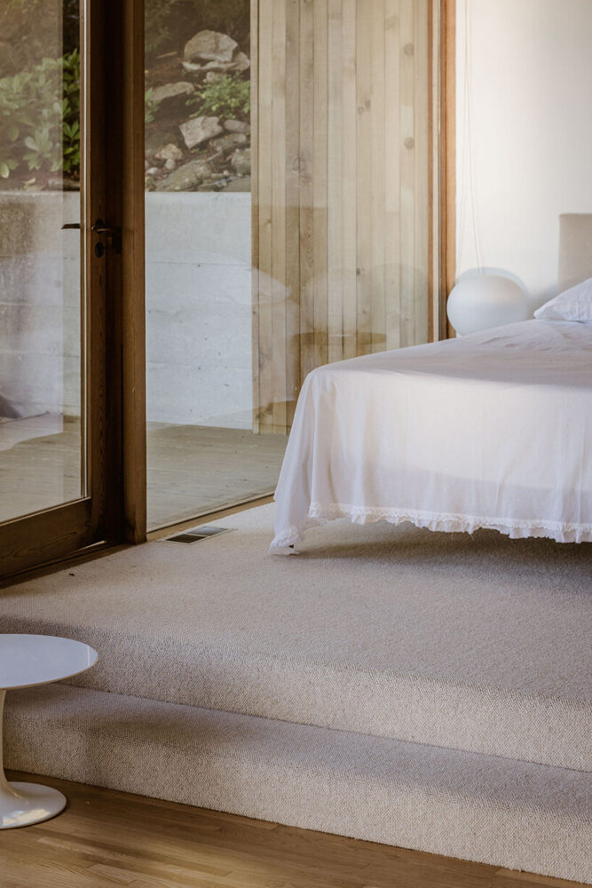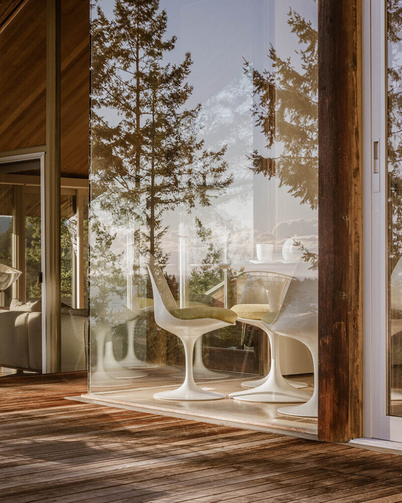 divided into two levels, the first one features the glassed-in living room which is centered around an angular fireplace. the dining area, kitchen, and master bedroom suite are also on this level. upstairs, the children’s quarters can be found, accommodating the needs of two generations.