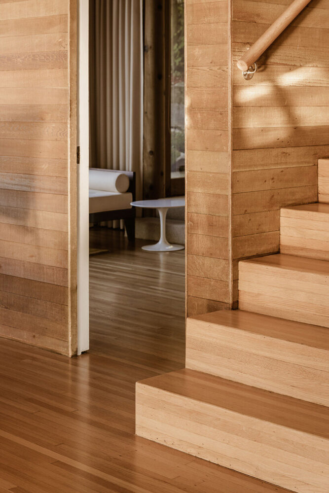 the cedar on the exterior is complemented by oak floors, and mahogany doors and cabinets in the interiors that feature the same treatment.