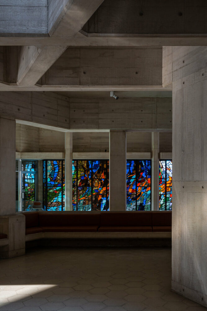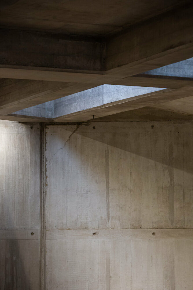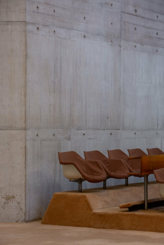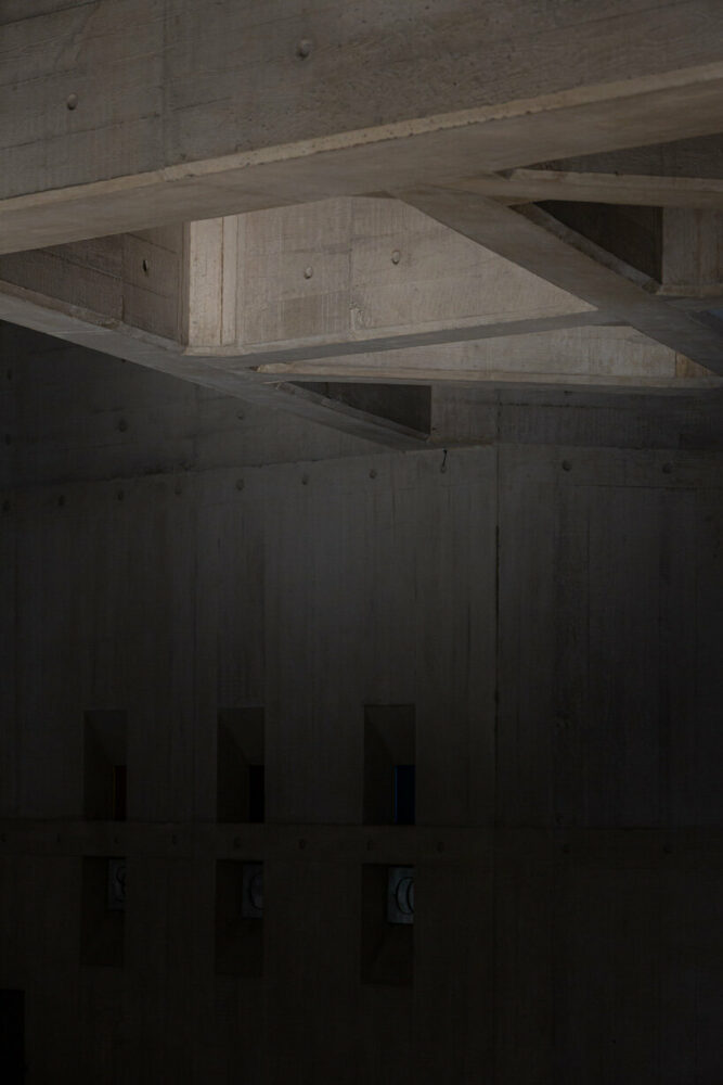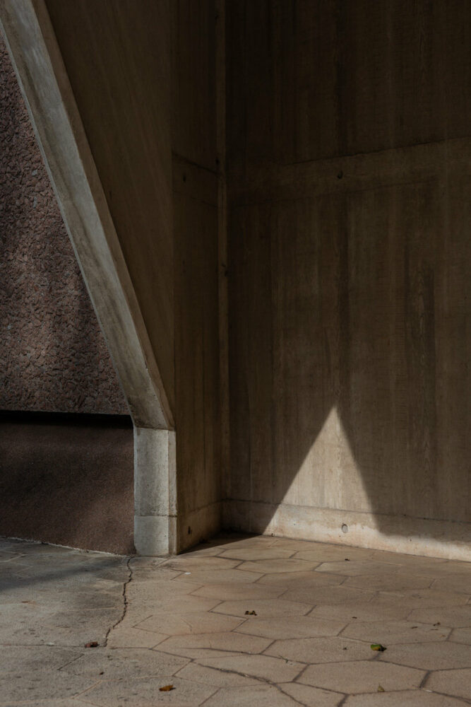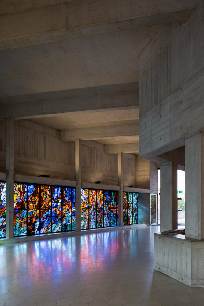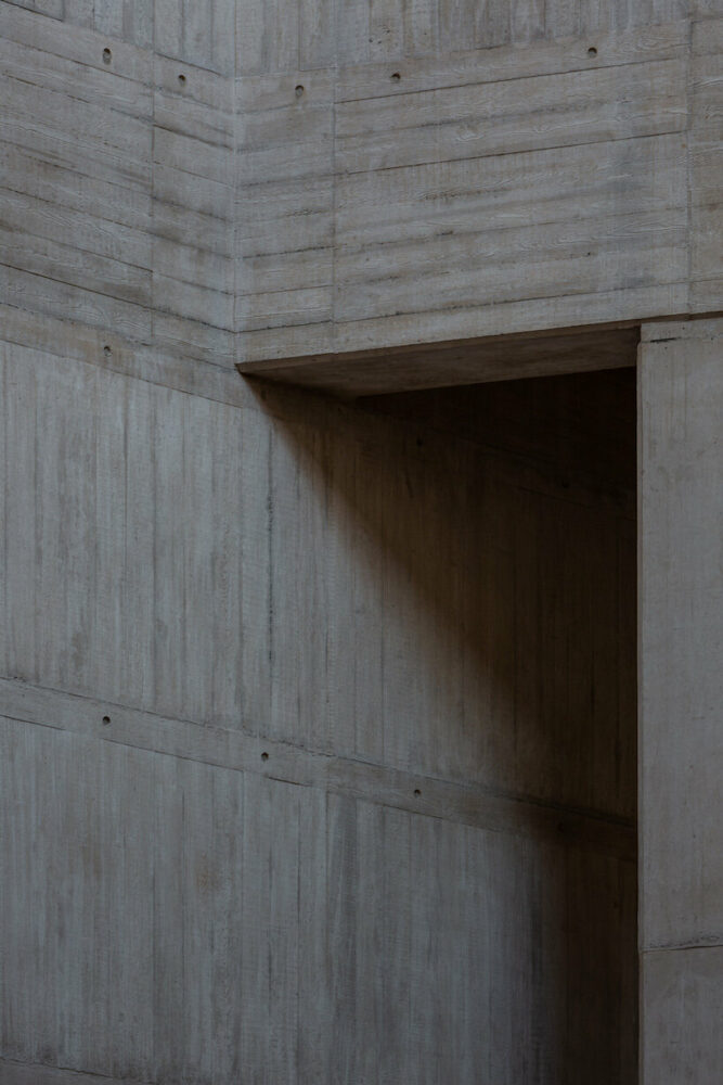 the project sits like a ring placed over the terrain, with its funnel-like roof forming a shaded perimeter walkway and an introverted core.