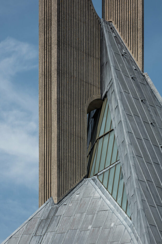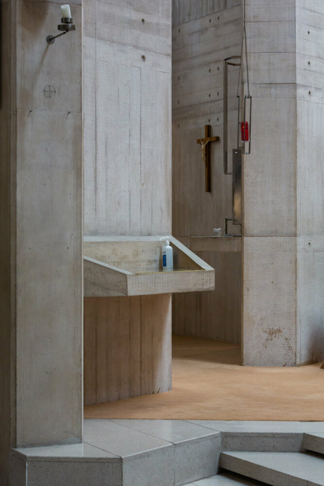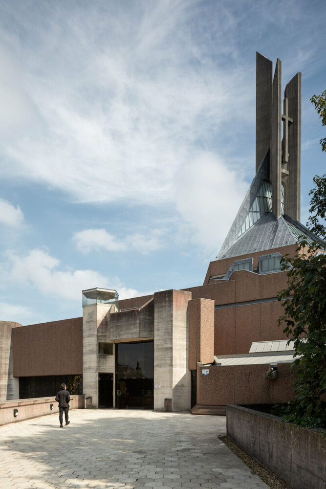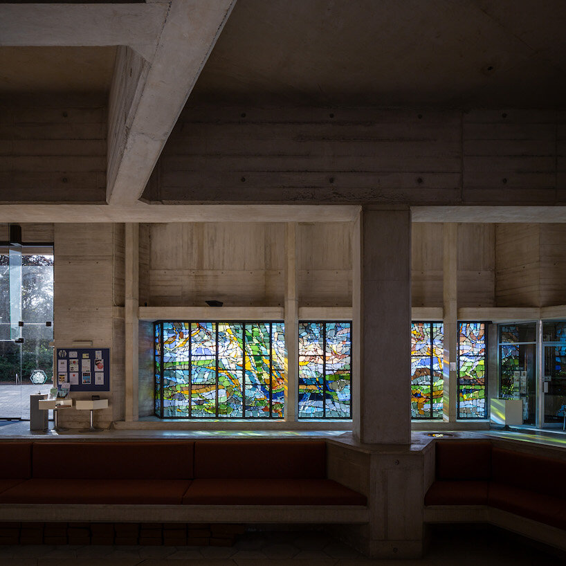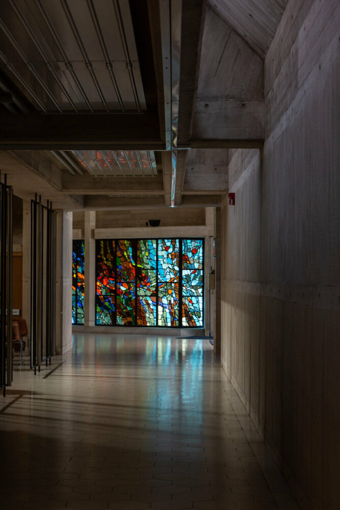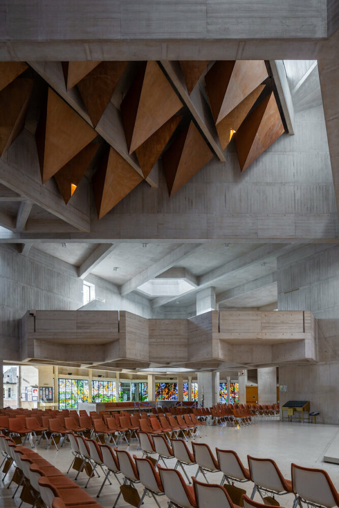 the project sits like a ring placed over the terrain, with its funnel-like roof forming a shaded perimeter walkway and an introverted core.