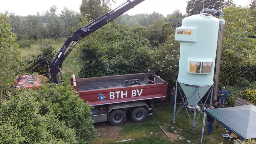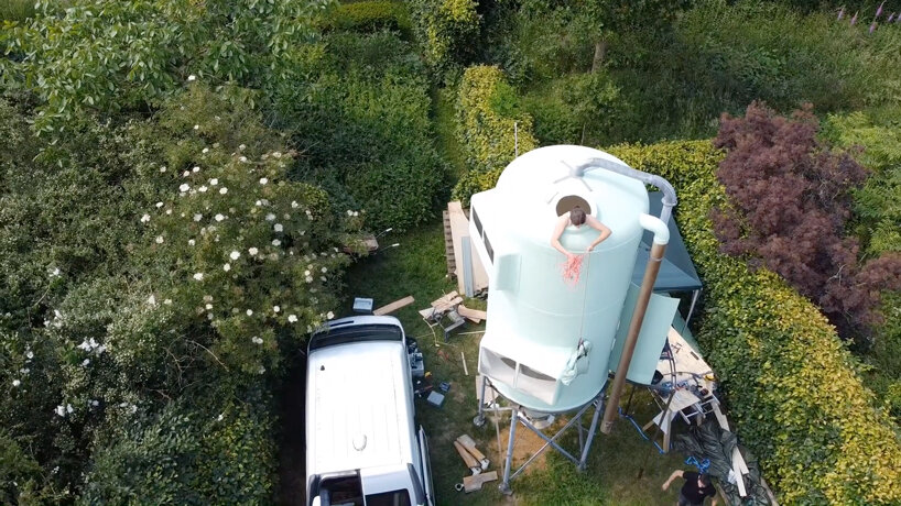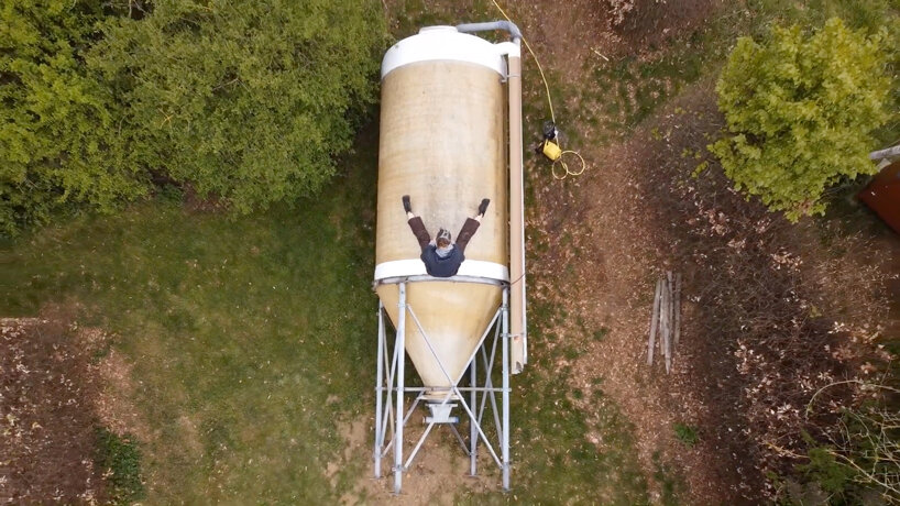 stella van beers began by removing the existing grain silo from the farm site and cleaning it down with a pressure washer. the design graduate then cut away at the structure to give the new living space pop-out windows on each level. a spiral staircase and a two-leaf door were added to access the dwelling. van beers also gave the silo a circular lookout porthole for rooftop views.