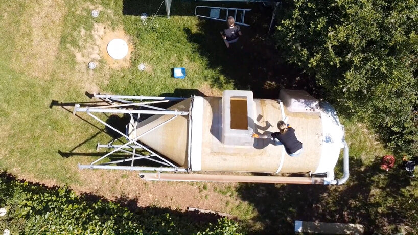 inside, the tiny silo home features a light-filled living area on the lower level and a sleeping area on the top floor, which is accessed by a ladder.