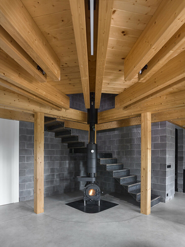 The house further prevents itself from overheating, due to its deep roof overhang. Alongside its pragmatic shape and passive shading, the building ensures comfort on summer days with shaders built into the triple-glazed windows. Guaranteeing warm interiors during the winter, warmth gathered from the sun is further aided by a stove with a heat exchanger at the heart of the house.