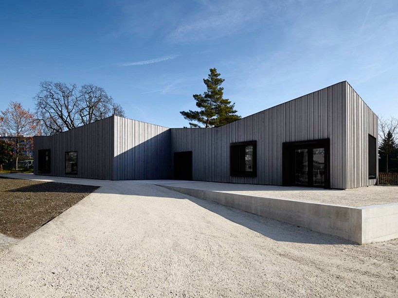 situated in the center of a public park in châtelaine-balexert, switzerland, this recreational community center has been completed by swiss studio stendardo menningen architectes. the structure, surrounded by several communal buildings, seeks to highlight a logical continuity and preservation of the existing landscape as well as the surrounding context. the east entrance of the site has been re-qualified by the latest construction whereas to the west, bleachers connect the building to the added esplanade.