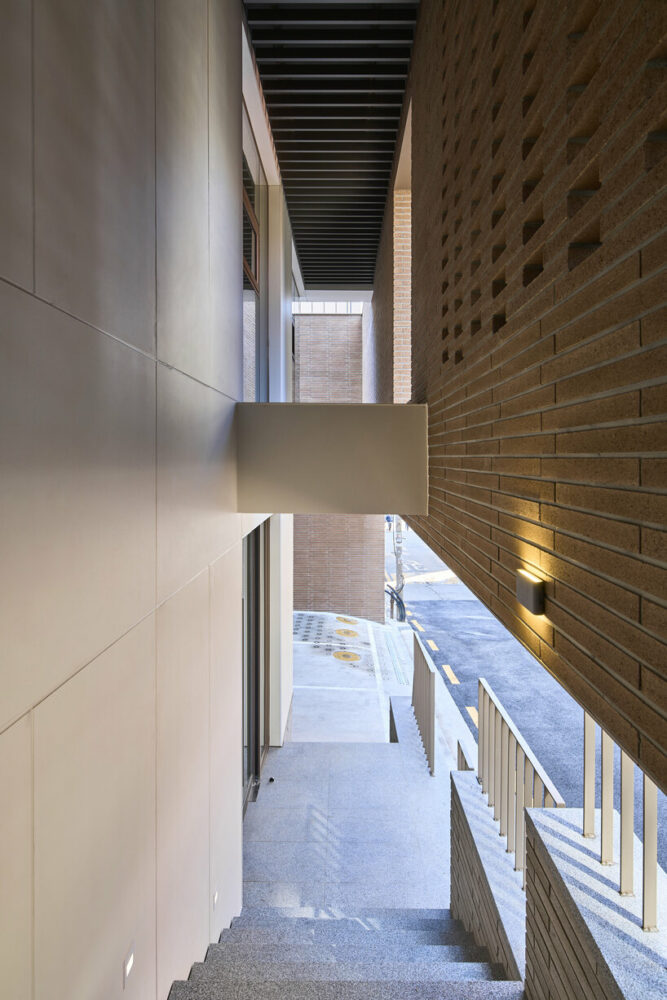 the project sits like a ring placed over the terrain, with its funnel-like roof forming a shaded perimeter walkway and an introverted core.