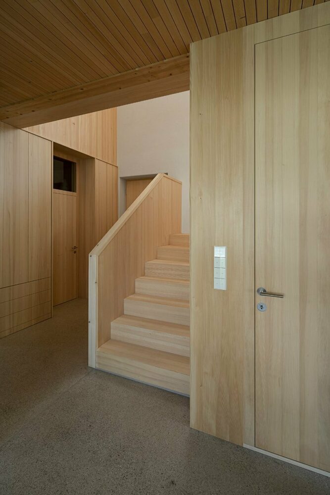 The bales are stacked on top of each other and plastered inside and out to shape the house’s main volume. The 1.20m thick outer walls made of large bales of straw, wood, and plaster made of trass lime and clay ensure excellent thermal insulation, heat storage, room acoustics, and an all-around pleasant room climate. The false ceiling is made of solid wood, while the floor covering is executed as a fair-faced screed on the ground level and a solid wooden floor made of silver fir is laid on the upper level. The materials used for the new building should in future be able to be returned to the natural cycle without any problems. The new construction consumes very little energy and heating expenditure.