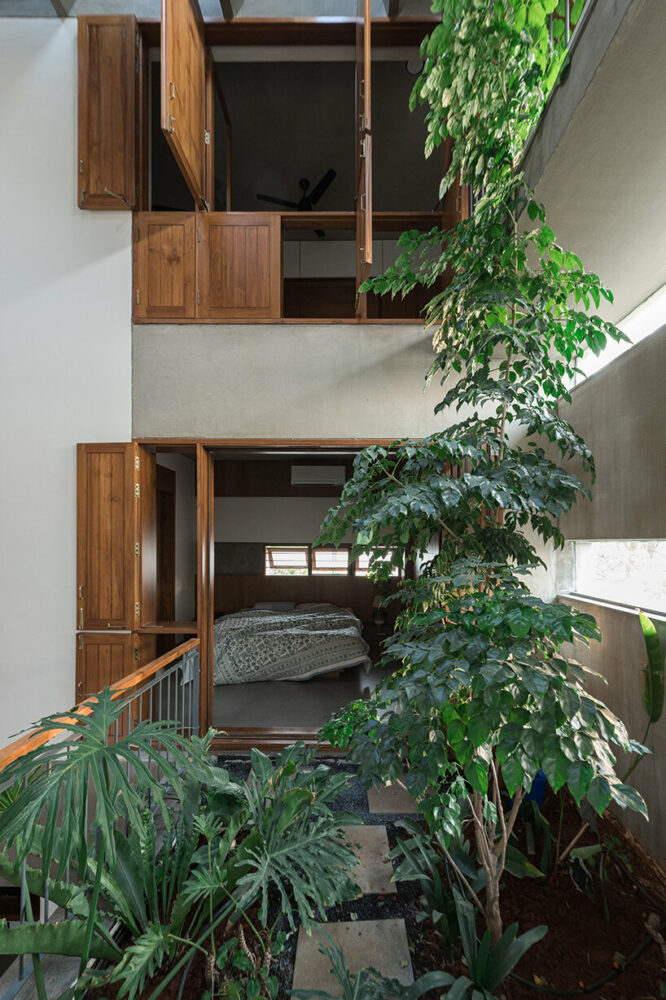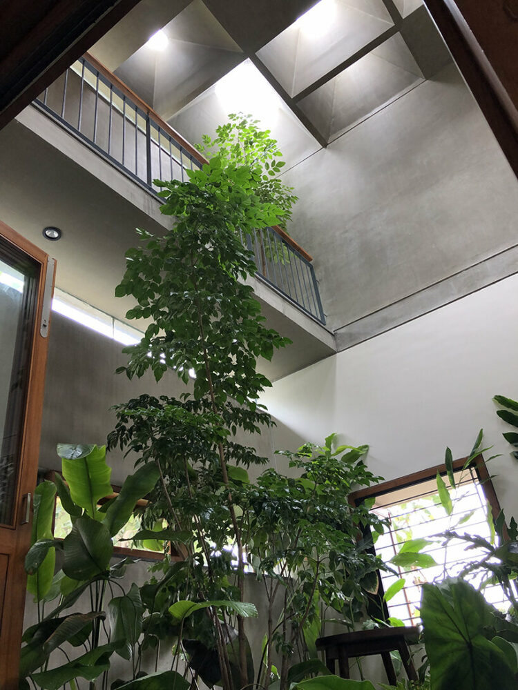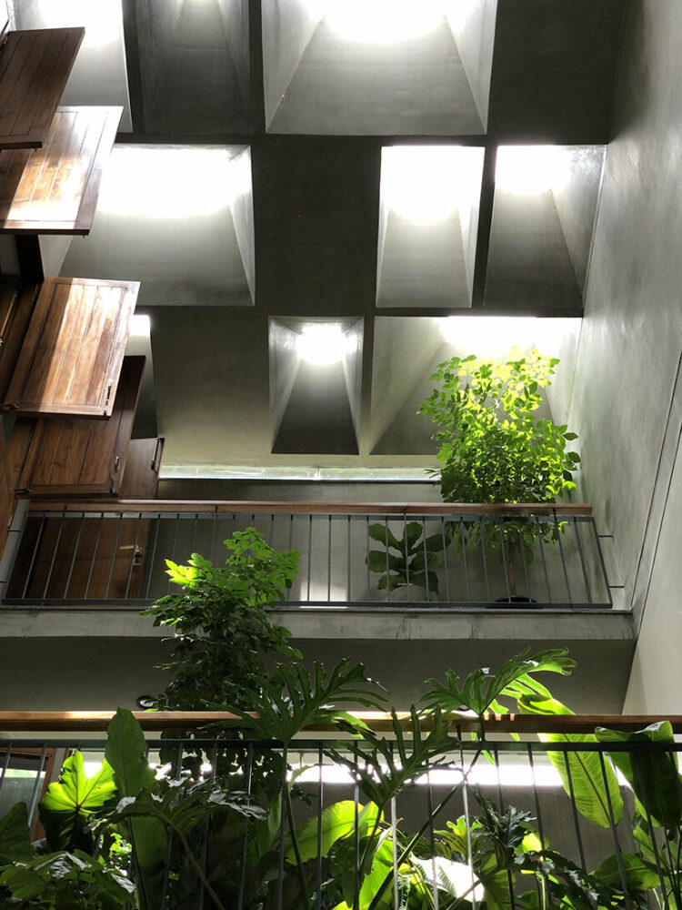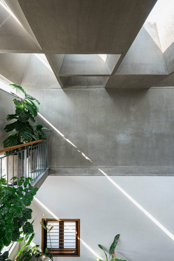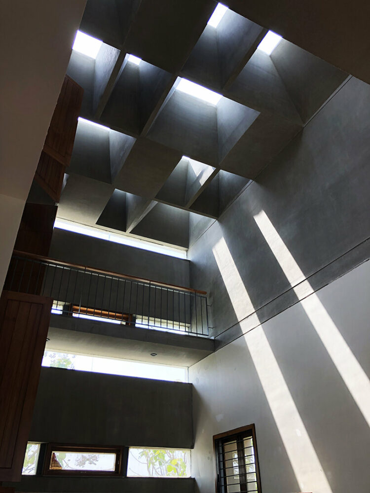 streams of natural light pour down on A threshold's green-terraced residence in bangalore