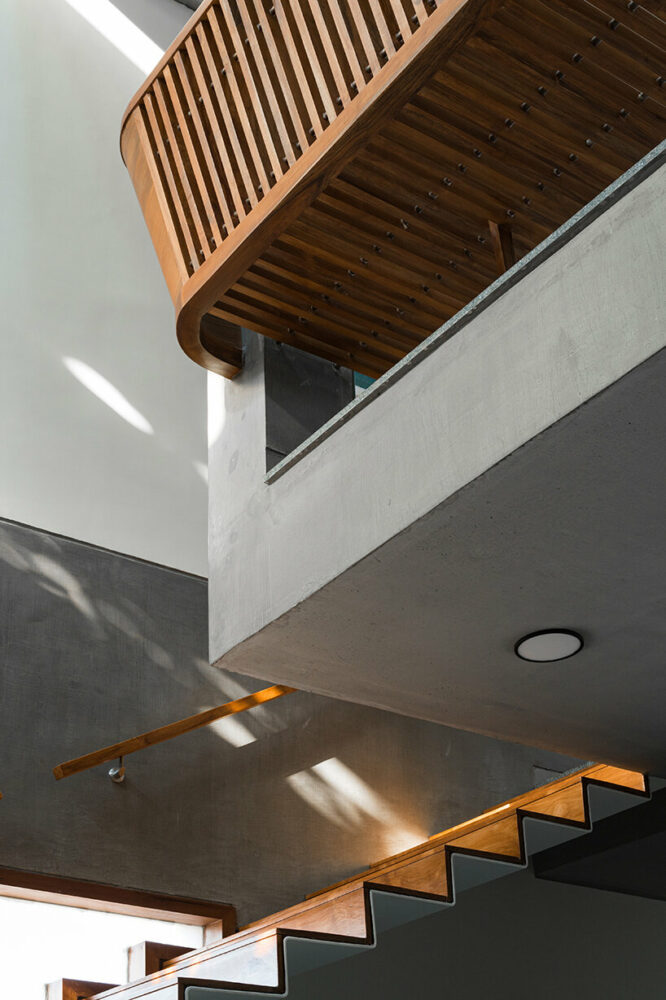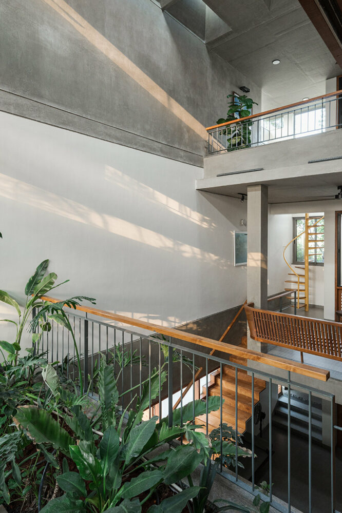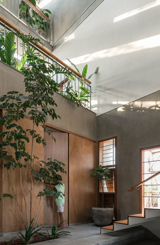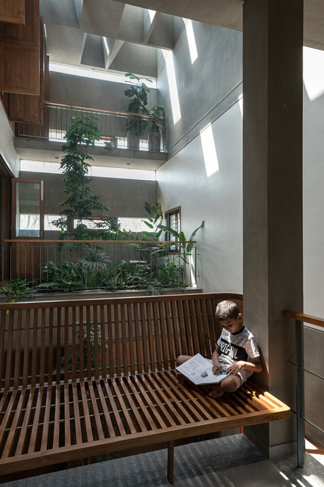 The section allows multiple opportunities to experience the tree from within the house, fulfilling the architects’ primary objective of fostering a close connection with nature. Dining, kitchen, living, family, and gathering spaces open up strategically to get framed glimpses of this tree. The green terraces are also multiplied internally to become extensions of living and bedroom spaces, offering a seamless transition between indoor and outdoor living. Interconnected green courtyards, overlapping sections, and levels allow residents to have visual connectivity throughout the house. Lastly, the central axis serves as a focal point that unifies the entire home with a thoughtful layering of spaces and activities while also establishing a connection with nature. The central space acts as a binding element, seamlessly weaving together various activities and allowing them to function autonomously yet harmoniously as a whole.