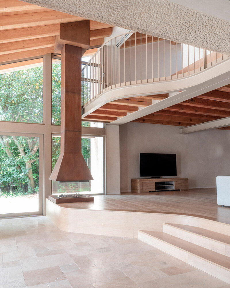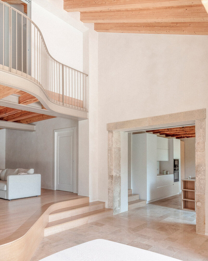 Inside, the home’s interiors are warm and bright, defined by a palette of natural and textured surfaces. Floors of oak wood and travertine, light plaster finishes, and exposed beams tell the story of a strong bond with tradition. Natural light enters through wide openings, creating soft atmospheres, while the new portico becomes a living frame that brings the quietness of the hills indoors.