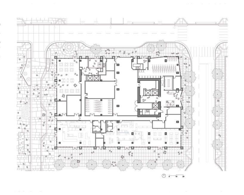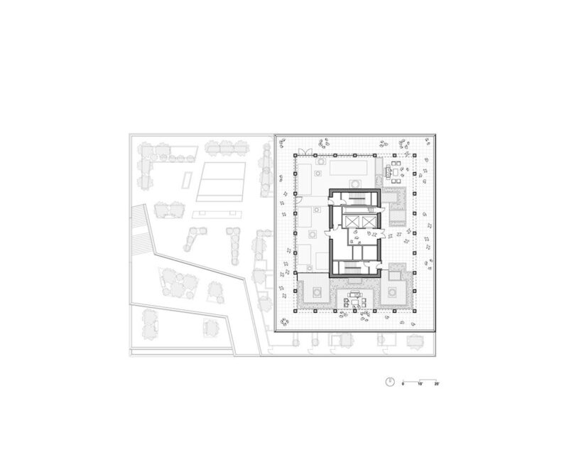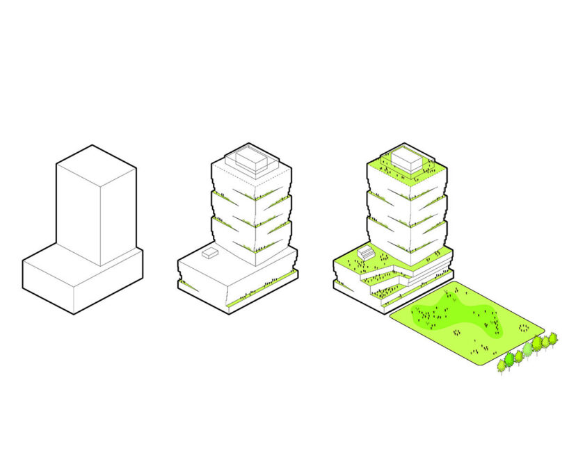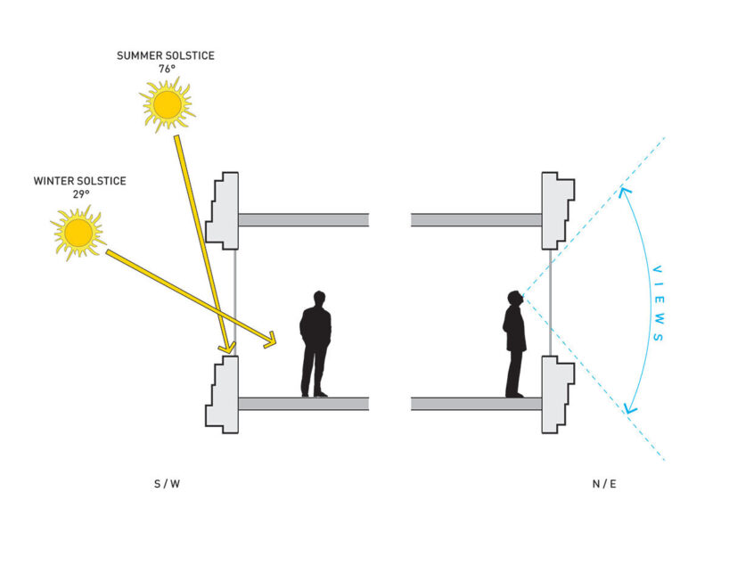 the project sits like a ring placed over the terrain, with its funnel-like roof forming a shaded perimeter walkway and an introverted core.