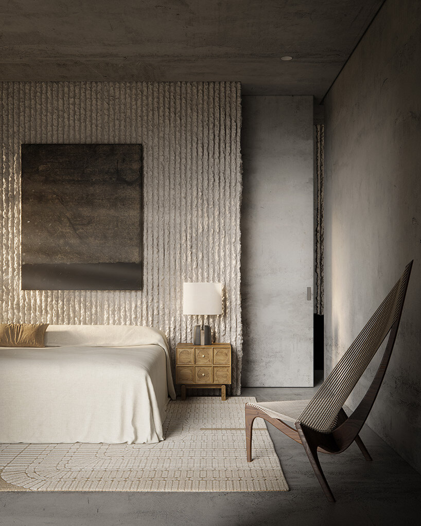 Fabrics and other materials are intentionally sourced from local artisans and vendors. From the alpaca wool from a neighboring farm used in the rugs and textiles to the local limestone that is turned into paint pigments and used throughout the house, the local sourcing helps give the home a monolithic yet convivial feel.