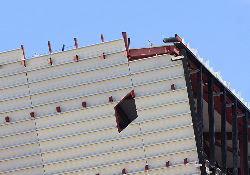 the project sits like a ring placed over the terrain, with its funnel-like roof forming a shaded perimeter walkway and an introverted core.