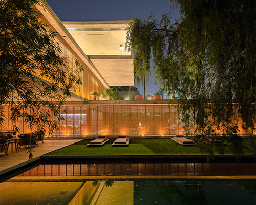 brazilian practice studio mk27 has shared with us one of their newest houses, ‘casa P’ located on the far side of the pinheiros river that meanders its way through the dense city of sao paulo. the house is based around the stacking of three exposed concrete boxes of different dimensions, pivoting around a structural central core containing the vertical circulation. the layering of cantilevered volumes creates covered terraces over various levels that maintain a constant and diverse relationship between interior and exterior. on the ground floor, the living and dining room share access to the yard and swimming pool, open on either end placing the living spaces with the lush vegetation around it. the bedrooms on the second floor look out over the garden and enjoy access onto the terrace at the roof of the program below. the same volume, perpendicular to the other two, cantilevers over the entrance area while shading yet another exterior deck. the top box containing the family room hovers over the property, supported by the second volume, and offers views of the distant city. along the open sides of the concrete structures, a porous wooden freijó wall acts as a screen from the intense sun but allows for permanent cross ventilation helping to cool the interior- the top volume is instead enclosed in glass in order to maintain views. in the basement, a laundry room, stark white garage, utility rooms and gym provide technical support to the rest of the house.