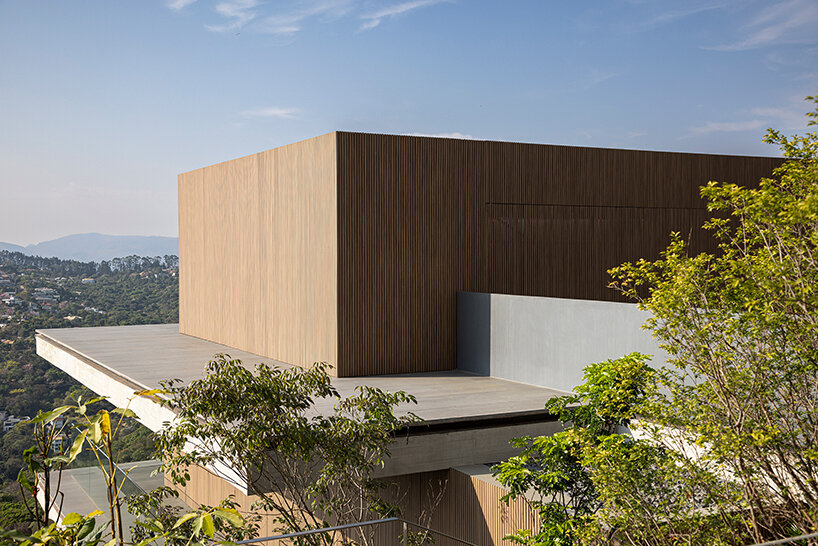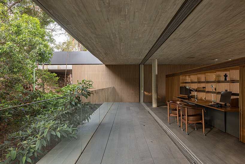 Hovering above the Minas Gerais mountains in Brazil, ‘Minas House’ by Studio MK27 is a multileveled dwelling set on an especially steep, dramatic site. The volume combines two concrete slabs, lifted 10 meters above ground with a sequence of stilts disguised amidst the tree trunks of a garden recalling a rainforest. ‘Suspending the house on stilts allows for rainwater to drain and for the house to breathe,‘ writes the studio.